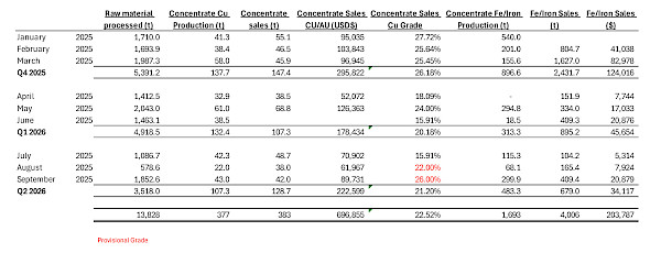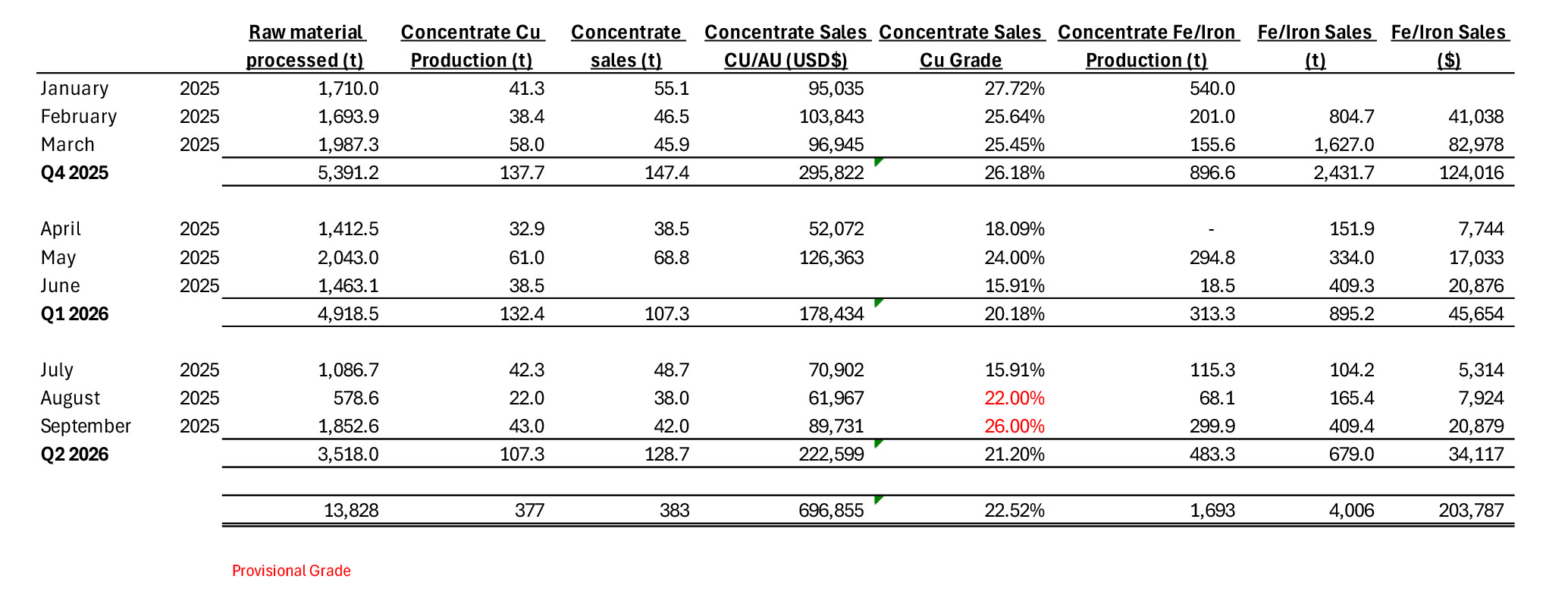 - During the reporting period July to September 2025, the Company generated US$256,717 (CS360,600*) from the sale of 128.7 tonnes of copper/gold concentrate representing US$222,600, and 483 tonnes of iron representing US$34,117 (Figure 3.)